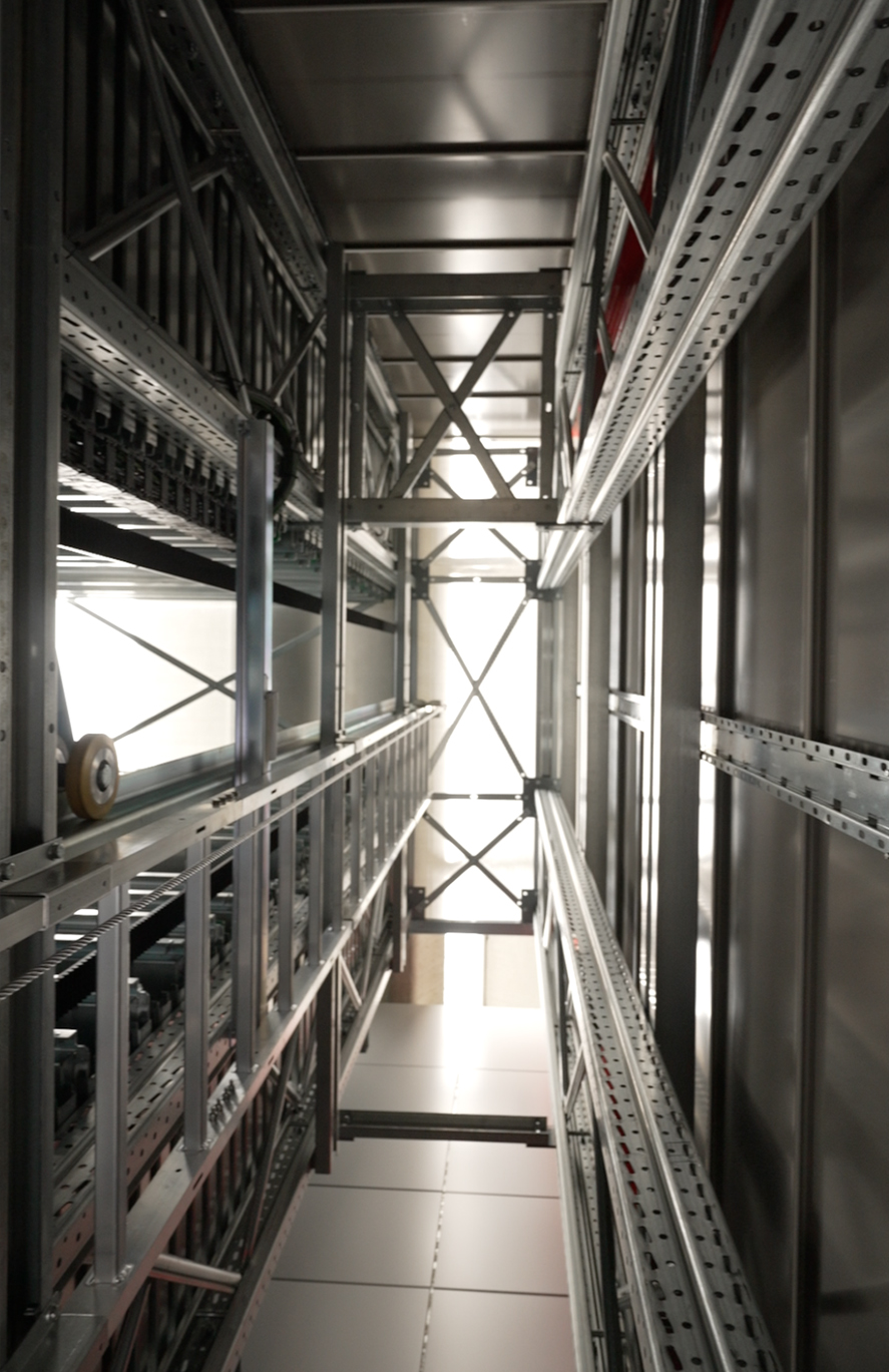 - Carrello verticale che si muove lungo l'asse Z, sopra il quale scorre un carrello orizzontale per lo spostamento fra i vari moduli (sollevamento, traslazione, deposito/prelievo).
